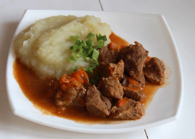 Доведите содержимое сковороды до кипения и на медленном огне тушите под крышкой около 1 часа до мягкости мяса. Точное время тушения зависит от выбранной части туши, возраста животного и степени нагрева.