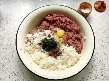 Круглозерный рис варила до готовности. Но по опыту знаю, что чем более сырой рис добавляю в фаш, тем "крепче" котлеты. Мне хотелось мягких и сочных в этот раз. В фарш добавила домашний сушеный укроп, он пахнет как свежий. Фарш убрала в холодильник на час, чтобы он стал плотнее.