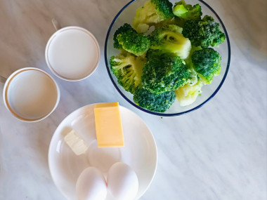 Подготовьте необходимые ингредиенты для приготовления запеканки из брокколи в духовке. Капусту можно взять как свежую, так и замороженную. У меня второй вариант. Сыр подойдет и плавленный, и твердый. Жирность сливок выбирайте по вкусу (10-20%). Яйца, молоко, сливки достаньте из холодильника заранее, чтобы они немного согрелись при комнатной температуре.