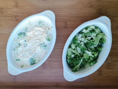 Форму для запекания смажьте кусочком сливочного масла, выложите равномерно соцветия брокколи. У меня 2 формы объемом 280 мл.