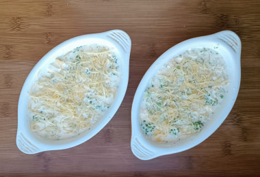 Также, в формочках перемешала брокколи со смесью, чтобы сыр распределился по всей начинке, так как если не перемешать, то весь сыр останется сверху. Сверху посыпала тёртым сыром и поставила запеканку в духовку, примерно на 30 минут. Запеканка готова, когда станет упругой, не останется жидкости и появится красивая румяная корочка. Если хочется более хрустящую корочку, то сыр можно перемешать с панировочными сухарями и этой смесью посыпать запеканку и отправить в духовку.