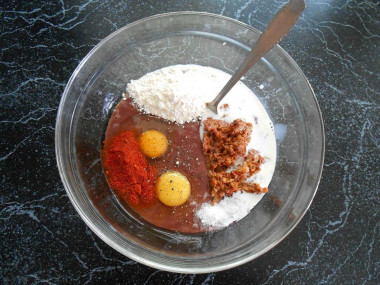 Добавьте в фарш яйца, паприку, соль и перец и тщательно перемешайте.