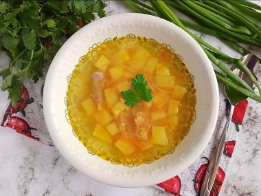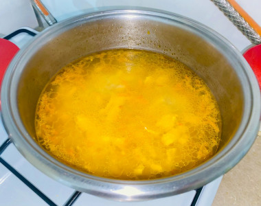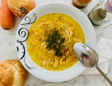 Выбрала рецепт супа с курицей и макаронами, чтобы быстренько приготовить обед. Бульон у меня был уже готов, только из голени индейки. Осталось сделать поджарку из лука и моркови. В это время картофель уже дошел до готовности, добавила разобраное на кусочки мясо. Проварила все вместе еще 5 минут и запустила в суп вермишель. Она тонкая, поэтому буквально довела до кипения суп и оставила настояться на 10 минут под крышкой. Специи никакие не добавляла, но супчик при этом стал красивого золотистого цвета. Он легкий, вкусный, ароматный! Рекомендую!
