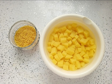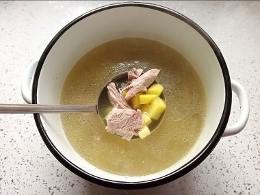 Курицу залейте холодной водой, доведите до кипения и проварите 30 минут. При закипании будет образовываться пенка, которую необходимо снимать. Затем вытащите курицу и отделите мясо от костей. Бульон процедите через мелкое сито. Верните мясо в процеженный бульон и снова доведите всё до кипения. Картофель нарежьте на небольшие кусочки и добавьте в кастрюлю. Варите все вместе минут 10.