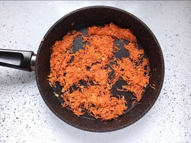 На горячую сковороду налейте немного растительного масла и выложите измельченные лук и морковь. Обжаривайте все вместе 3-4 минуты. Не забывайте периодически помешивать, чтобы овощи не подгорели. Подгоревшая зажарка может испортить вкус всего супа.