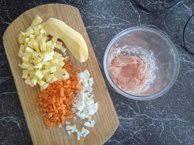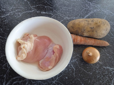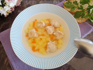 Понравился мне рецепт своей универсальностью подбора овощей. Взяла для приготовления самые простые и доступные овощи - картошку, морковку и лук репчатый. Для фрикаделек выбрала филе домашней курицы. Мелко порезанные овощи отварила в подсоленной воде. Из куриного мяса сделала фарш, перемолола погружным блендером до пастообразного состояния и налепила фрикаделек. Очень легкое и быстрое приготовление вкуснейшего супчика.