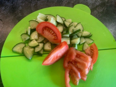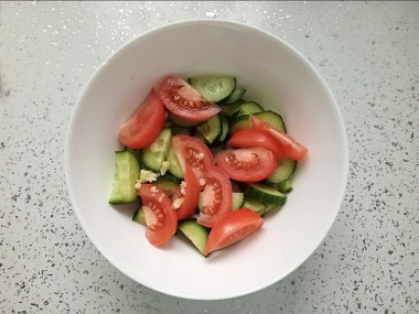 Из остатков овощей сделала себе на ужин салат помидоры с огурцами и сыром.