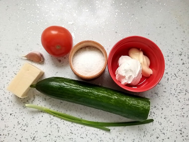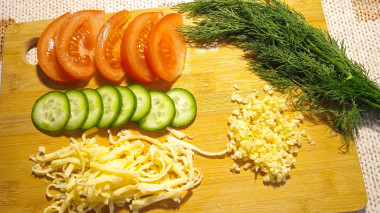 Огурец у меня был гладкий салатный, поэтому сразу нарезала его полукружьями. А если шкурка у огурца жесткая, то лучше ее срезать. Помидор нарезала дольками. Сыр у меня твердый голландский, натерла его на крупной тёрке. Для заправки смешала густую сметану и майонез, мне кажется, так вкуснее).