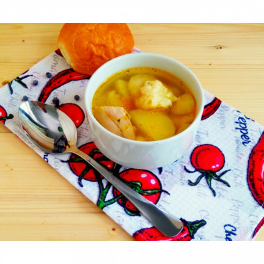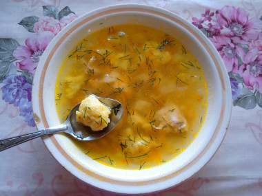 Для нашей семьи суп - неотъемлемая часть обеда. Сегодня приготовила куриный суп с клецками. Готовила на втором бульоне, т.к. бедрышки оказались очень жирными, да и бульон так получился прозрачнее. Лук решила сварить целиком, а в конце варки вынула из супа. Клецки по этому рецепту получились нежными и вкусными. Очень аппетитный, яркий супчик. Детям понравился!