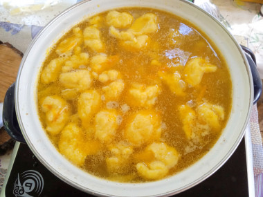 Возьмите две ложки (от размера ложек будет зависеть размер клёцек), смочите их в воде. Готовое тесто берите ложкой небольшими порциями, с помощью другой ложки снимайте его прямо в горячий бульон. Так проделайте со всем тестом. Осторожно перемешайте суп, чтобы клёцки не склеились между собой. Добавьте соль, чёрный молотый перец в суп.
