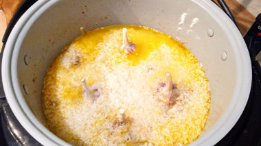 Аккуратно, чтобы не смыть слой риса, вливаем воду. Зарываем в рис головку чеснока, с которой предварительно убрали верхний слой шелухи