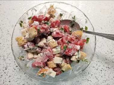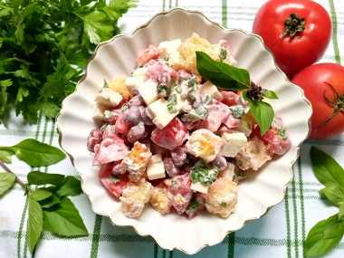 В салатнике соедините помидоры, консервированную красную фасоль, сыр, сухарики и зелень. Заправьте салат майонезом. При желании можете посолить, поперчить, но лично я очень редко добавляю специи в салаты с майонезом.