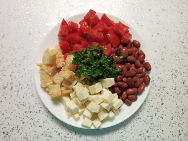 Как сделать салат из фасоли, помидоров, сыра и сухариков? Подготовьте все необходимые ингредиенты для салата. Консервированную фасоль можете использовать как белую, так и красную или их смесь. Также неплохо получится со стручковой зеленой фасолью. Только ее нужно будет предварительно отварить в подсоленной воде до готовности.