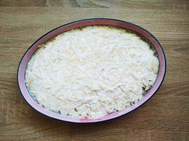 Выбранную форму для запекания смажьте растительным маслом и выложите половину картофельно-сырной массы. Массу равномерно распределите по дну формы.