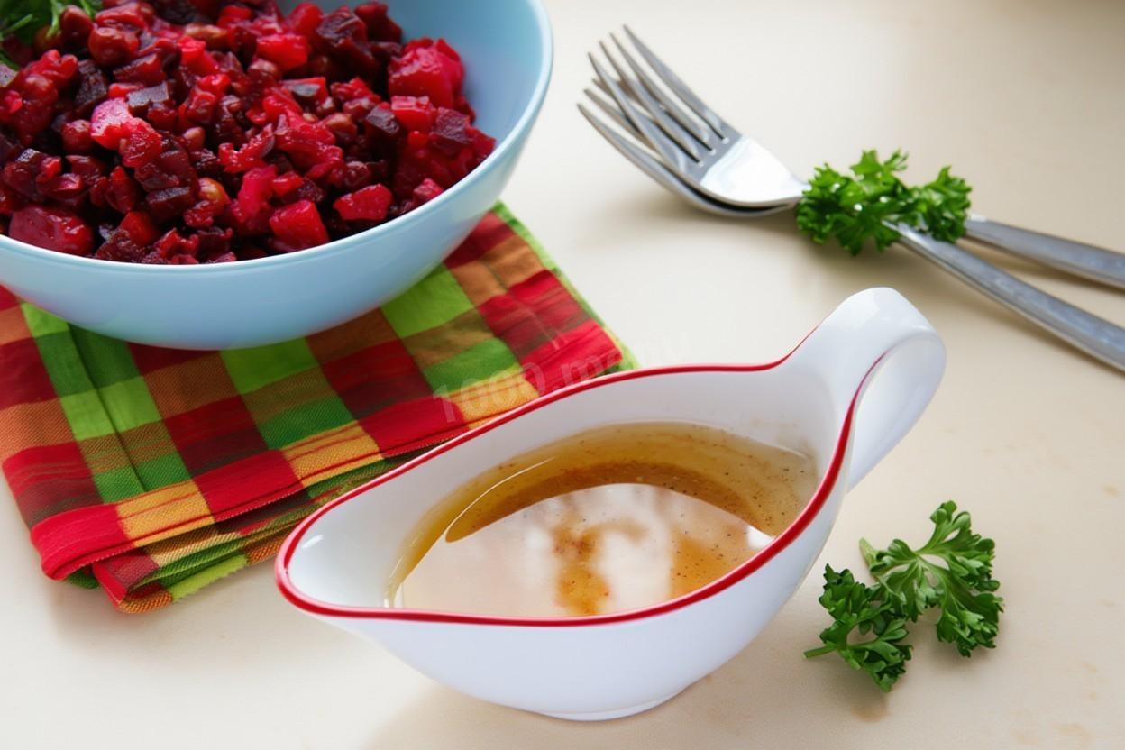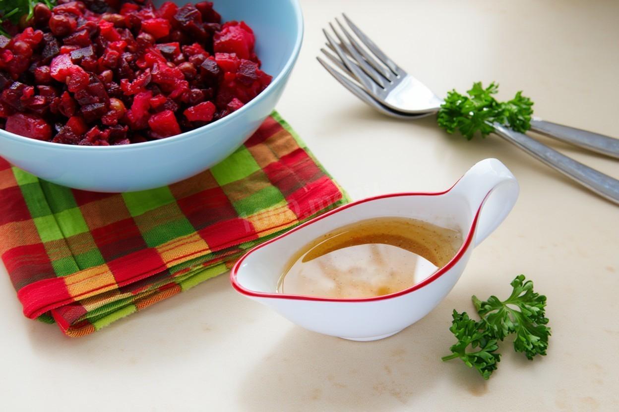 Перемешайте заправку. Обращаю ваше внимание на то, что горчица, уксус и масло имеют разную плотность. Из-за этого горчица всегда будет оседать под своей тяжестью на дно соусника. Поэтому перемешать заправку до однородности вряд ли получится. На этом заправка готова! Осталось только заправить ею винегрет и можно подавать к столу. Приятного аппетита!