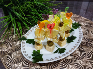 Следом за лимоном нанизывайте на шпажки зеленые оливки, после чего накалите на каждую шпажку кусочек сыра. Если лимон и оливки можно поменять местами, то сыр нет. Его необходимо нанизывать в последнюю очередь, так как он имеет квадратную форму и за счет твердости держит ее, а значит будет устойчивым в отличии от остальных ингредиентов. Канапе готовы.