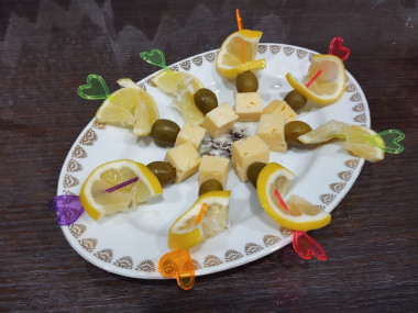 Сыр нарезала на кубики, лимон порезала полукольцами. Нанизала на шпажки все составляющие и подала на стол.