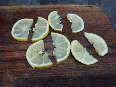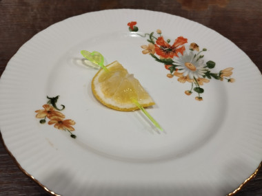 Лимон обдайте кипятком и насухо вытрите его. Затем тонко нарежьте его кружками. Кружки разрежьте пополам, чтобы получились лимонные полукольца. Лимонные кусочки должны быть обязательно тонко нарезаны, чтобы они хорошо гнулись их можно было без проблем насадить на шпажки.