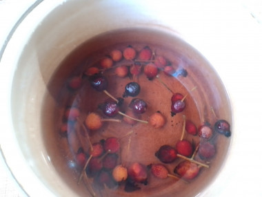 Сушеный шиповник тщательно промойте. Лучше даже обдать его кипятком, чтобы удалить налет и пыль, которая может быть на поверхности ягод. Положите ягоды в кастрюлю или иную посуду для варки компота, немного подавите шиповник толкушкой, но не растирайте их в пыль. Ягоды должны остаться целыми.