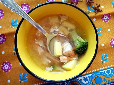 Бульон варила из домашней курицы, взяла грудку, чтобы мясо было и спинку для навара. Домашняя курочка долго варится, у меня часа два ушло. Луковица за это время выварилась, отдав свои соки и я ее удалила. Бульон процедила, а кастрюлю помыла. Таким образом получился идеальный прозрачный бульон с янтарными бусинками куриного жирка. Картошку, морковь и брокколи проварила в нём до готовности и сразу разлила по тарелкам.