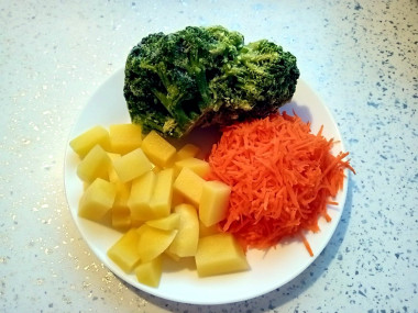 В кастрюлю с бульоном добавьте кубики картофеля, тертую морковь и соцветия брокколи.
