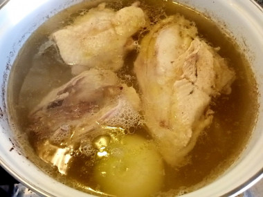 В кастрюлю выложите курицу, целую луковицу, зубчик чеснока. Влейте 2 л воды. Поставьте кастрюлю на сильный огонь. Доведите воду до кипения, снимите пену шумовкой. Затем огонь убавьте до среднего и варите курицу 40 минут до готовности, периодически снимая пену.