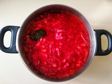 В конце варки бросьте в кастрюлю лавровый лист, мелко нарезанный укроп и петрушку или другую зелень по вкусу. Это обогатит борщ свежим ароматом. Проварите примерно 1 минуту и выключите огонь. Дайте борщу "настояться". Накройте кастрюлю крышкой и оставьте минимум на 20-30 минут, а в идеале - на 1-2 часа.