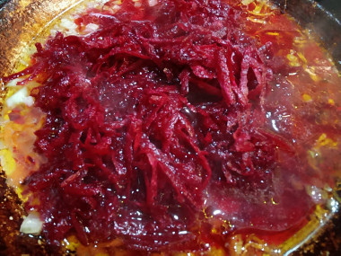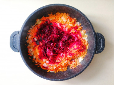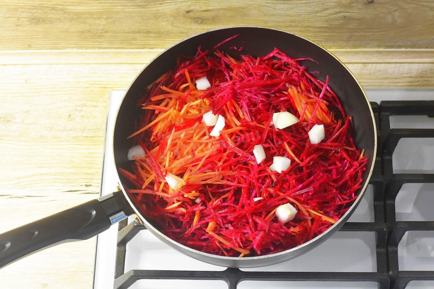 Пока варится бульон с мясом, приготовьте заправку с тушеными овощами. В разогретую сковороду выложите лук и морковь со свеклой. Влейте немного бульона из кастрюли, чтобы он слегка покрывал овощи. Тушите на медленном огне под крышкой примерно 20-30 минут.