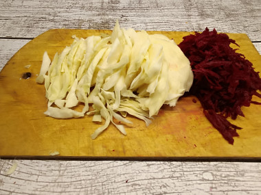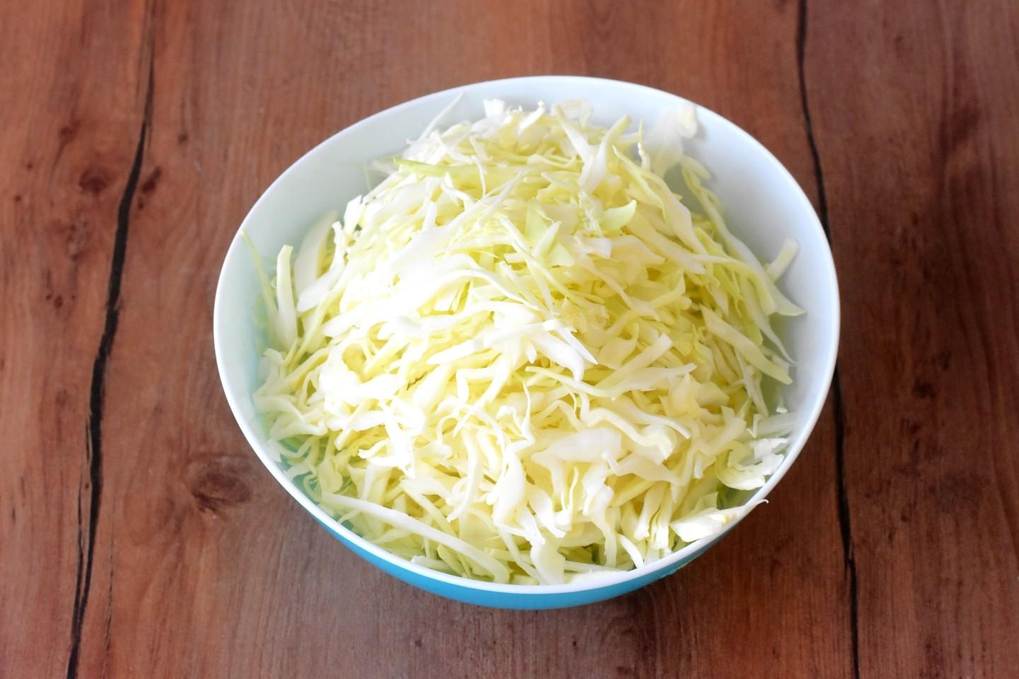 Снимите верхние поврежденные или вялые листья со свежей капусты. Разрежьте кочан на четвертинки. Острым ножом аккуратно срежьте твердую кочерыжку. Положите четвертинку срезом вниз на разделочную доску. Острым ножом нарежьте капусту поперек листьев на тонкую соломку желаемой толщины. Чем тоньше вы нарежете, тем быстрее и мягче она сварится. Так же можно воспользоваться кухонным комбайном.