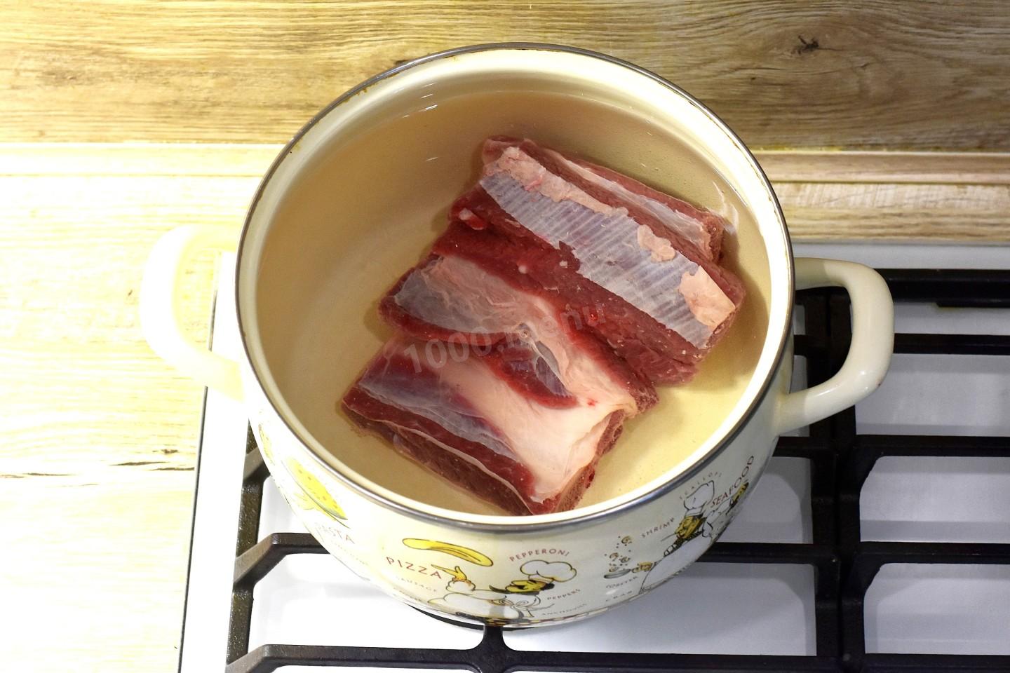 Говядину промойте и выложите в кастрюлю, влейте воду. Варите на среднем огне до готовности мяса около 1 часа, снимая пену. Если нужен наваристый бульон, берите мясо на кости. У меня говяжьи ребрышки. О том, как подобрать идеальную кастрюлю для первого блюда и правильно рассчитать количество воды, читайте в конце рецепта.
