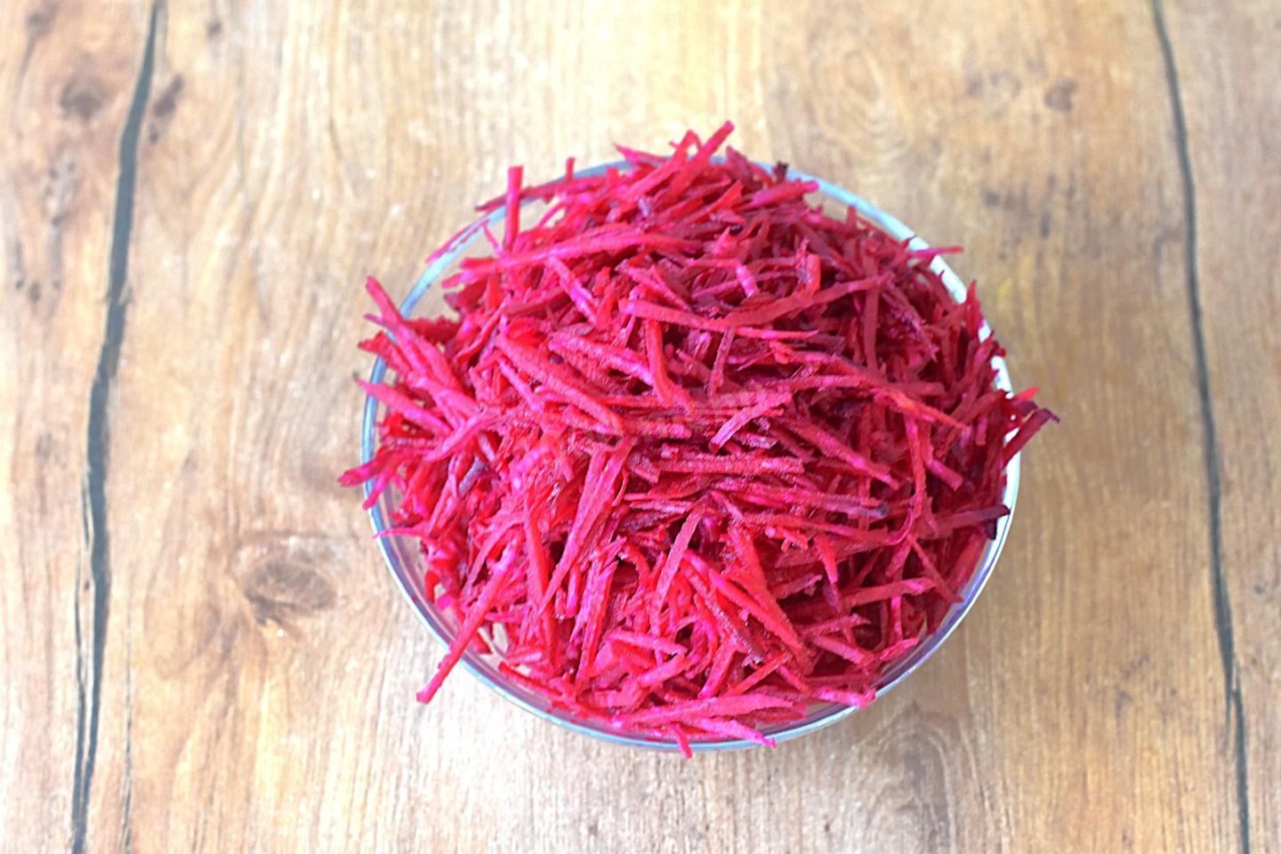 Свеклу тщательно вымойте под проточной водой с помощью щетки или жесткой мочалки и очистите от кожуры. Натрите на крупной терке или с помощью кухонного комбайна. Можно нарезать тонкими ломтиками, соломкой. Подробнее о работе с привычной кухонной тёркой читайте в материале по ссылке в конце рецепта.