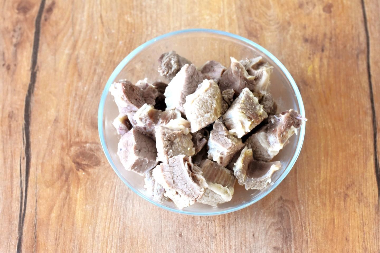 Мясо выньте из бульона, немного остудите, отделите от костей и нарежьте небольшими кусочками или разберите на волокна.