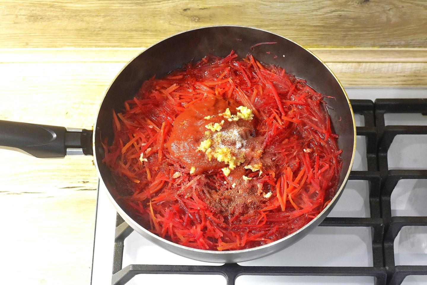 Чтобы борщ с томатной пастой был по-настоящему красным, свеклу тушите отдельно с небольшим количеством кислоты (уксус или лимонный сок).