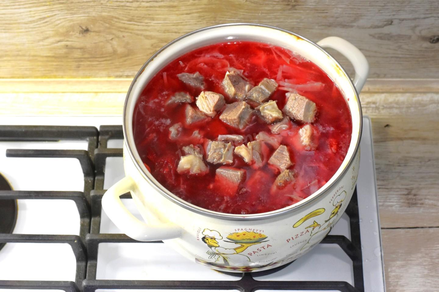 Переложите заправку в кастрюлю. Следом отправьте нарезанную говядину. Перемешайте и варите борщ с тушеными овощами на небольшом огне до готовности овощей еще около 3-5 минут. Обязательно попробуйте борщ на соль, кислинку и специи. По желанию можете добавить немного лимонного сока или уксуса. Если борщ слишком кислый, можно добавить щепотку сахара, чтобы сбалансировать вкус.