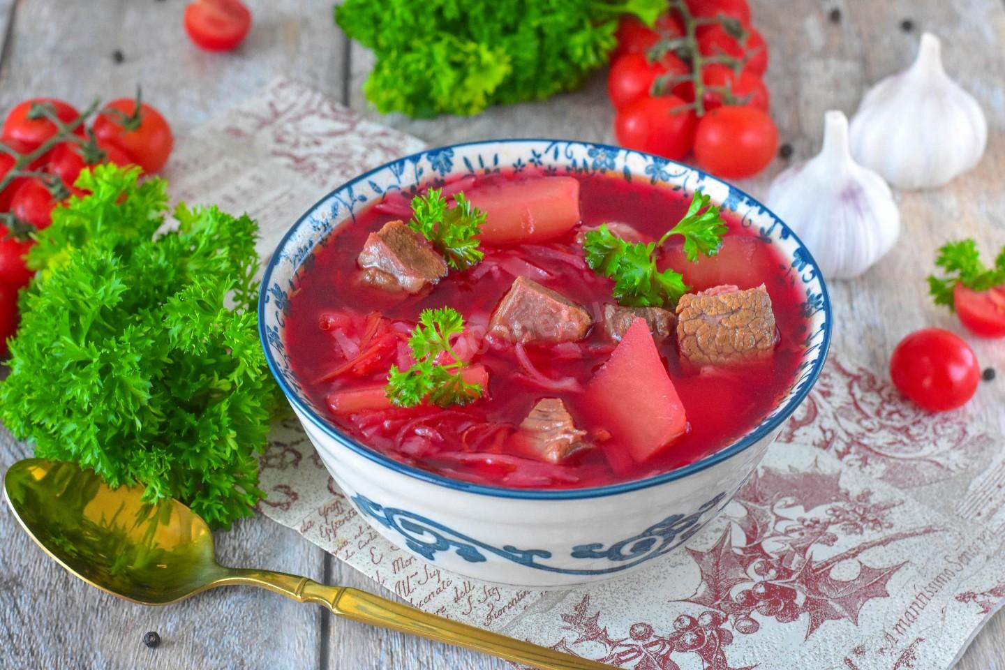 Вкусный домашний борщ на говяжьем бульоне, как в столовой. Простой рецепт с морковью и томатной пастой для насыщенного томатного вкуса. С чесноком и свеклой – аромат просто волшебный! Идеальное первое блюдо для всей семьи.