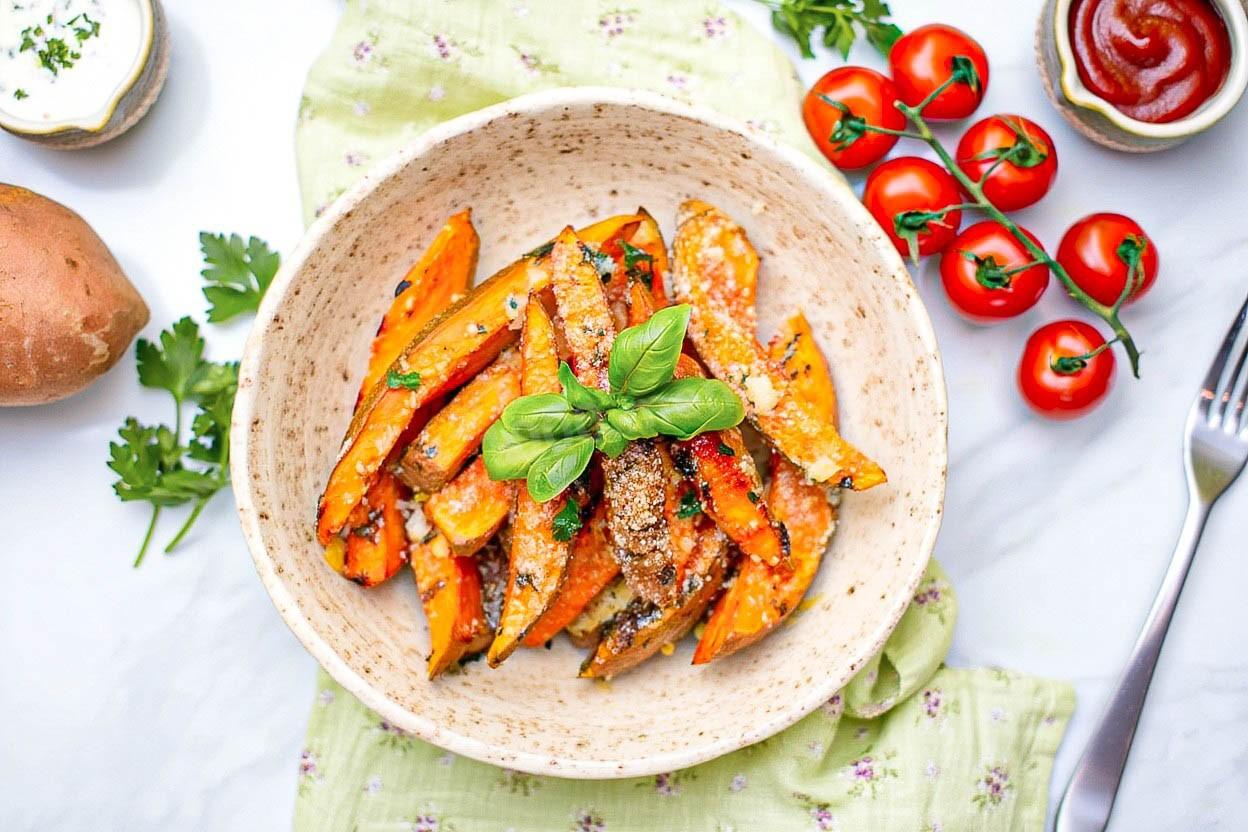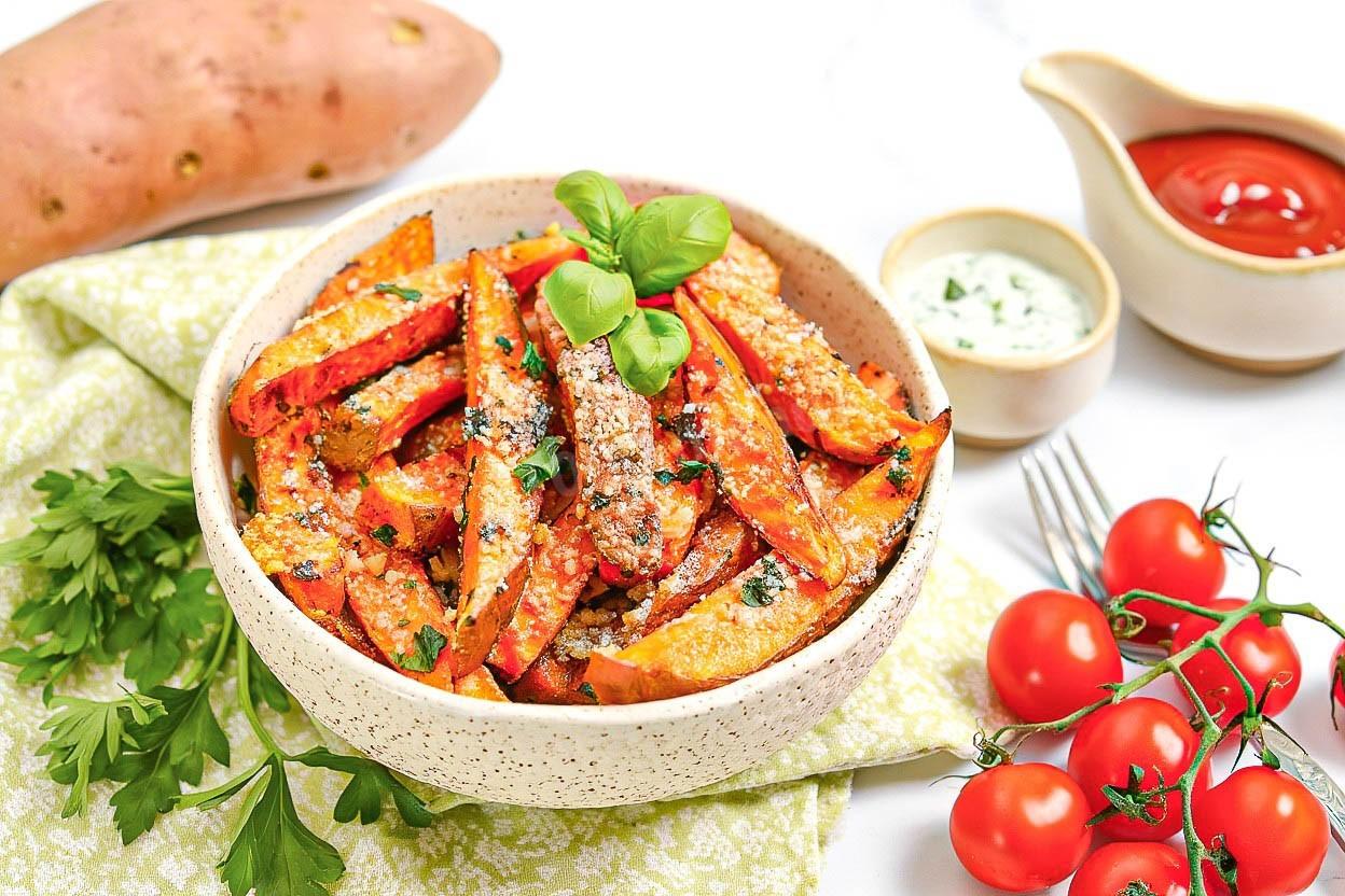 Батат родом из Центральной Америки, где его запекали с древних времён. Современная интерпретация с пармезаном и итальянскими травами — фьюжн-подход, популярный в домашней кухне.
