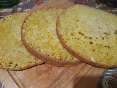 Разрежьте остывший бисквит на три коржа. Коржи получаются красивого цвета, от жёлтого до оранжевого в зависимости от сорта тыквы.