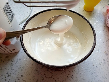 Включите высокие обороты и взбивайте, пока масса не станет белоснежной и глянцевой. Если вы используете ручной миксер или блендер, в процессе взбивания перемещайте насадки по всему объему миски, чтобы масса взбивалась равномерно. Она станет гуще и как бы увеличится в объеме. При подъеме венчика помазка должна медленно стекать, образовывая острый клин. Я потратила на это 10 минут.