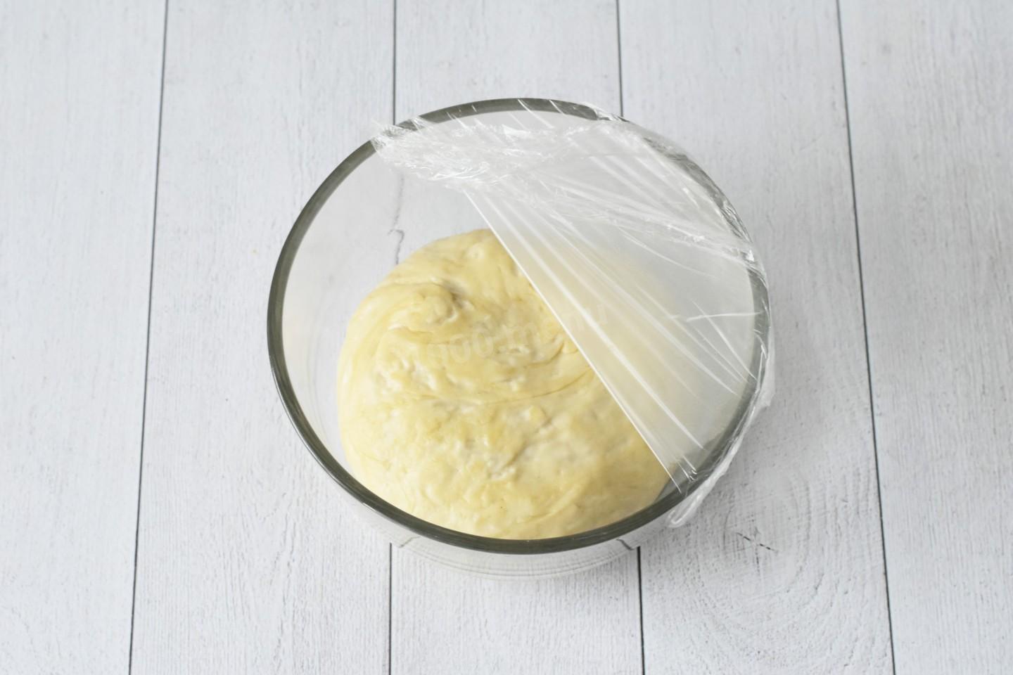 Тесто выложите в миску, затяните пищевой пленкой и оставьте в тепле для подъема на 1 час.