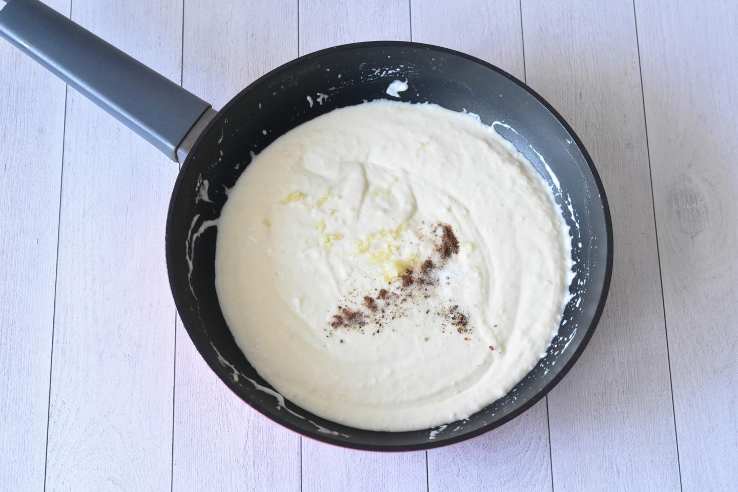 В сковороде на среднем огне растопите сливочное масло. Всыпьте муку и перемешайте до однородности. Влейте сливки и перемешайте соус до однородности. В конце добавьте пропущенный через пресс чеснок и специи. Тушите соус, помешивая, до загустения. Включите духовку на 200 градусов.