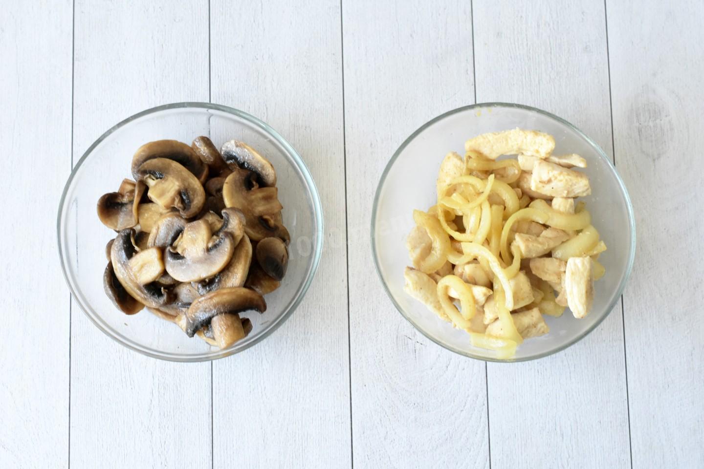 Шаг 6. Как обжарить грибы, лук и курицу для начинки?