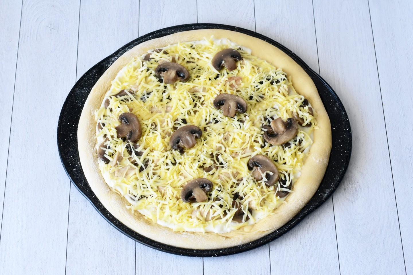 Тесто обомните и распределите по форме для пиццы. Сделайте бортики. Смажьте тесто соусом. Поверх распределите начинку и посыпьте тертым сыром. Сверху распределите отложенные грибы.