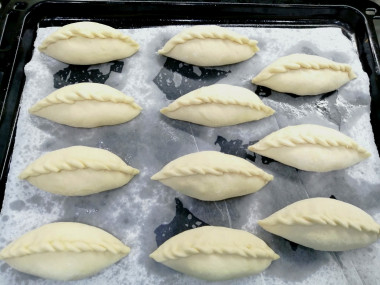 Выкладываем пирожки на присыпанный небольшим количеством муки противень и ставим расстаиваться на тридцать минут.