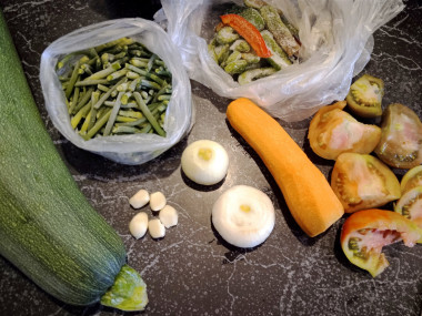 Калорийность продуктов: Кабачки, Фасоль стручковая зеленая, Болгарский перец, Морковь, Лук репчатый, Чеснок, Помидоры черри, Зелень, Соль, Перец острый молотый