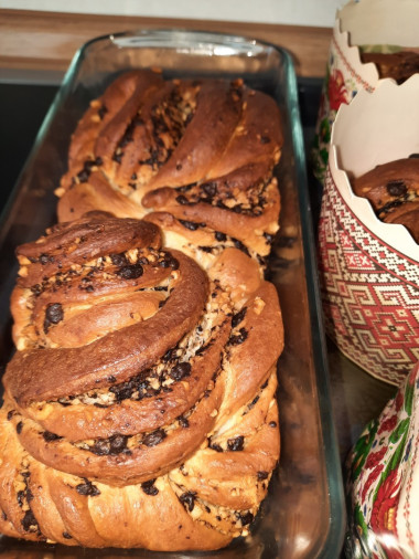 Замечательный рецепт Кулич краффин пасхальный. Фольгой не накрывала, не хотела духовку открывать. Начинку сделала шоколад и орех. Но куличи Краффин