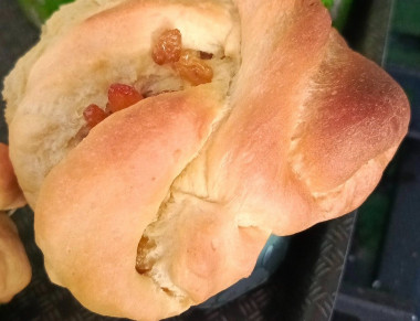 Через несколько дней дети снова попросила вкусных пасочек.Это были уже не пасочки,а булочки к чаю.Яблоки мелко порезала и карамелизировала,и потом добавила в тесто,а сиропом, оставшимся от яблок ,намазала ,перед тем как вытаскивать с духовки,крафинны.