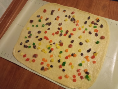 Возьмите одну часть теста. Раскатайте его в пласт. Можно на стол налить ложку масла растительного, тогда тесто не будет липнуть и будет хорошо раскатываться. Смажьте пласт маслом. Выложите поверх теста изюм и цукаты.