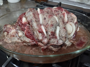 Затем фольгу уберите, полейте шейку соком со дна формы. Верните мясо в духовку и запекайте еще примерно 30 минут при 180°С. Точное время запекания зависит от особенностей вашей духовки. Верх шейки должен зарумяниться.