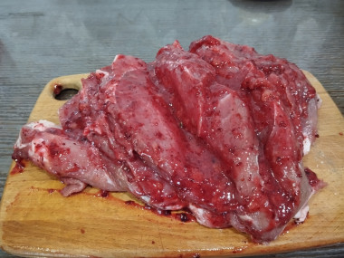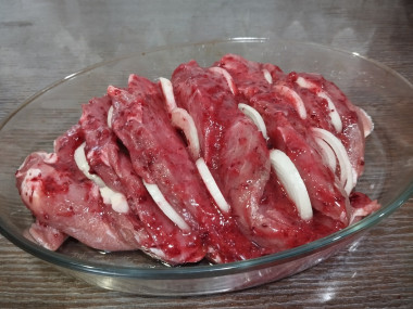 Луковицу очистите и нарежьте полукольцами. При этом старайтесь, чтобы полукольца не распадались на отдельные сегменты, ведь вставлять их в мясо нужно целиком.
