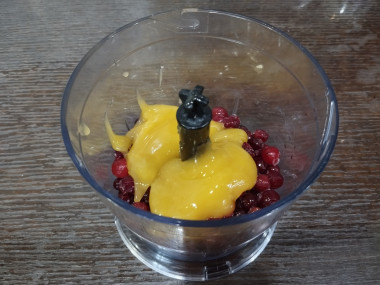 К ужину приготовила свиную шейку запечённую в духовке. Решила попробовать сочетание мяса с клюквой. Клюква у меня была замороженная, которую я промыла,обсушила и в чаше блендера пробила вместе с медом и маслом до однородной массы.